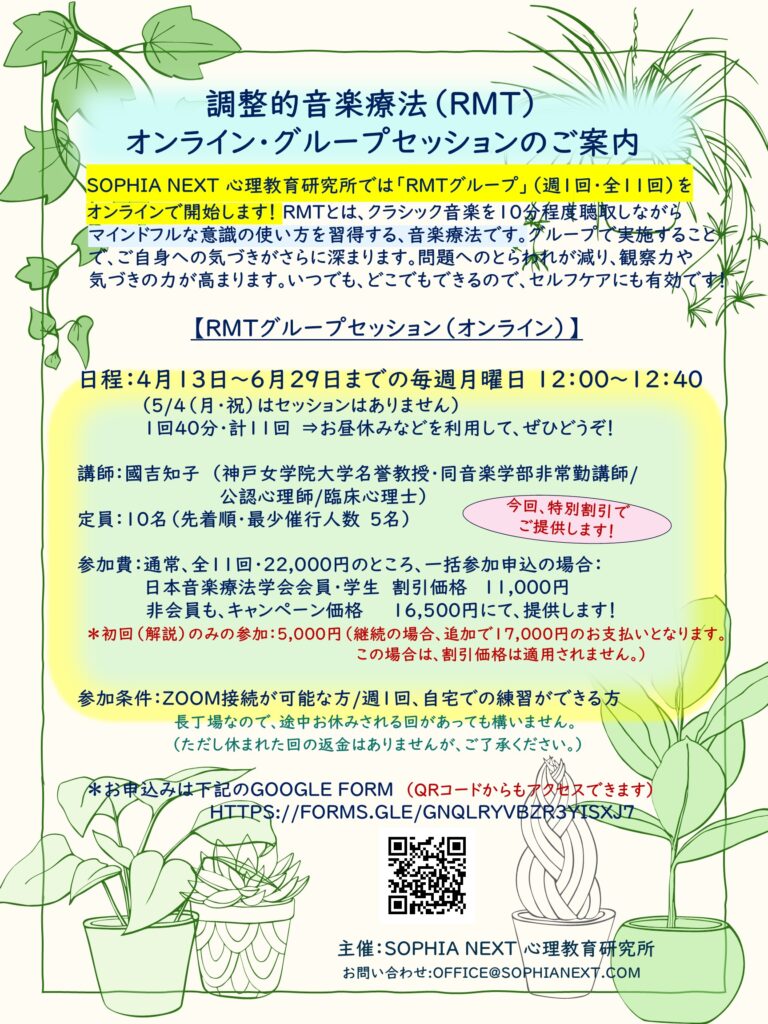 Sophia next では、4/13~6/29までの、毎週月曜日 12時~12時40分に、調整的音楽療法(RMT)のグループセッションをオンラインで開催します。(1回40分程度、計11回:5/4(祝)はセッションはありません。)お昼休みなどを利用して、ぜひご参加ください。